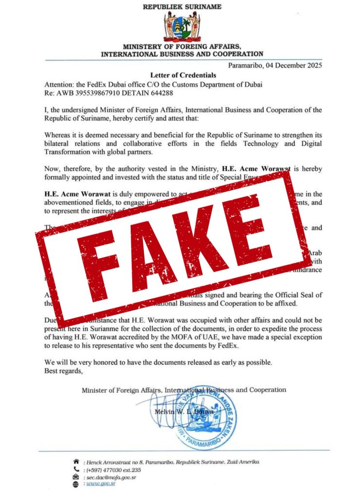 Het ministerie van Buitenlandse Zaken, Internationale Handel en Samenwerking van de Republiek Suriname brengt het volgende onder de aandacht: