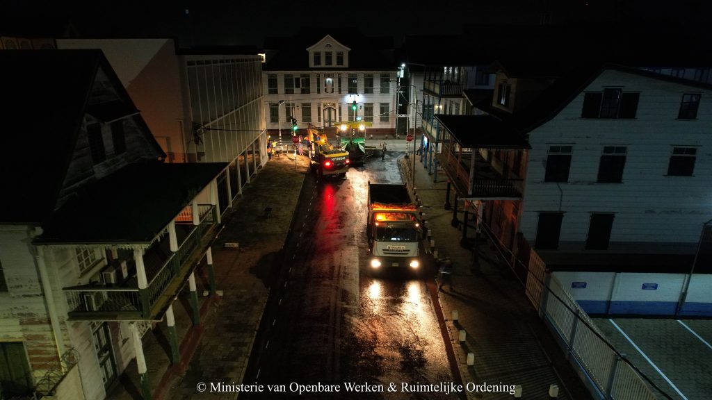 In het kader van het project “Rehabilitatie van harde en onverharde wegen in de districten Paramaribo, Wanica en Saramacca” zijn op dinsdag 12 november vanaf 18:00 uur tot in de vroege ochtend van woensdag 13 november omstreeks 06:00 uur asfalteringswerkzaamheden uitgevoerd aan de Watermolenstraat. De werkzaamheden worden uitgevoerd door aannemingsbedrijf Tjongalanga N.V., onder toezicht van de afdeling Wegen van het ministerie van Openbare Werken en Ruimtelijke Ordening (OWRO).