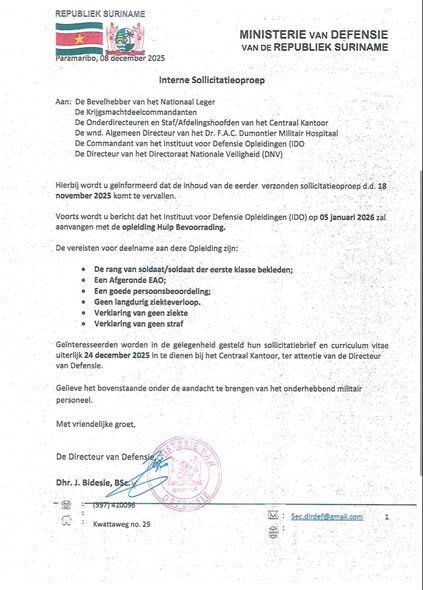 Minister Uraiqit Ramsaran van Defensie hecht groot belang aan de ontwikkeling en opleiding van het personeel. Het benutten van interne sollicitatiemogelijkheden is een belangrijk instrument om de capaciteiten van onze militairen verder te versterken en hun loopbaanmogelijkheden binnen Defensie te vergroten. In dat kader wordt hierbij uw aandacht gevraagd voor de interne sollicitatieoproepen voor het […]
