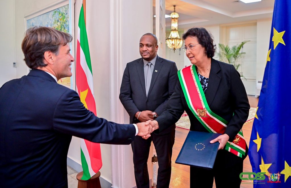 Het gaat om respectievelijk Ellen de Geest (namens België), Ernesto Torres Pereyra (namens de Dominicaanse Republiek) en Luca Pierantoni (voor de Europese Unie). De diplomaten hebben naast de officiële overhandiging van hun documenten, elk officieel kennisgemaakt met het Surinaamse staatshoofd. Dit gebeurde in aanwezigheid van minister Melvin Bouva van Buitenlandse Zaken, Internationale Samenwerking en Handel. Er is kort van gedachten gewisseld over de bilaterale betrekkingen en de wederzijdse ambities om de relaties te intensiveren. Ambassadeur de Geest sprak over de verdieping van de samenwerking tussen België en Suriname op het gebied van onderwijs, academische samenwerking, toerisme en blijvend engagement ten opzichte van Suriname en omgekeerd.
