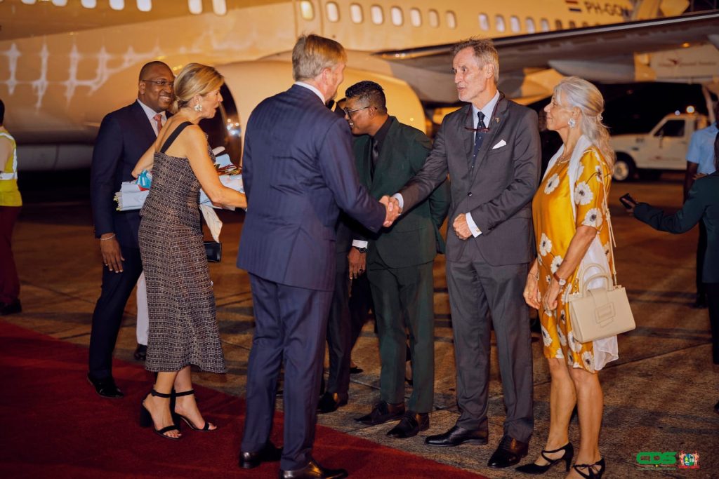 Het Koninklijk paar werd warm verwelkomd door een delegatie bestaande uit onder anderen minister Melvin Bouva van Buitenlandse Zaken, Internationale Handel en Samenwerking (BIS), de Nederlandse ambassadeur Walter Oostelbos en districtscommissaris Patrick Kensenhuis van Para.