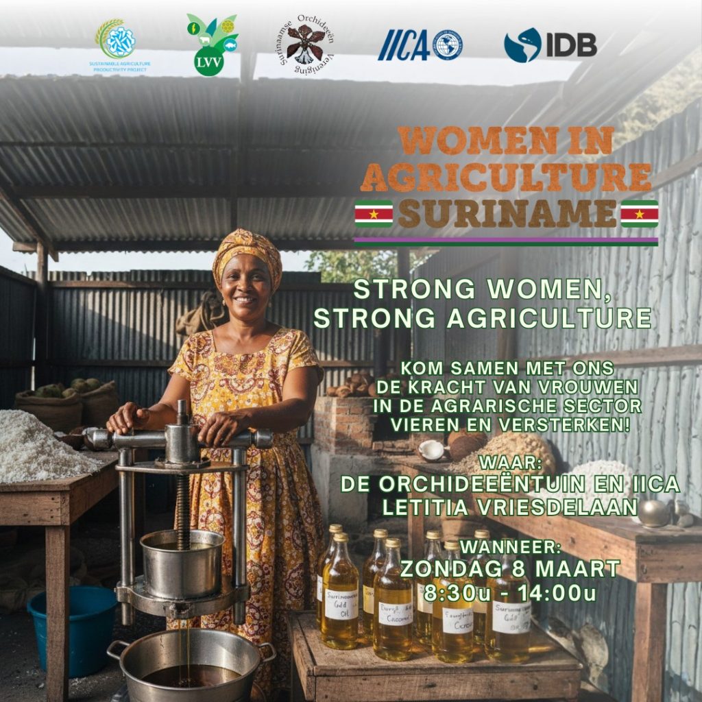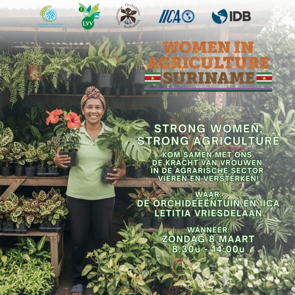 Tegen deze achtergrond vormt de Women in Agriculture Fair een belangrijk platform om vrouwen in de landbouw erkenning, zichtbaarheid en kansen te bieden. De beurs wordt georganiseerd door het Ministerie van Landbouw, Veeteelt en Visserij (LVV) en de Project Executing Unit (PEU) van het Inter-American Institute for Cooperation on Agriculture (IICA), in het kader van het Sustainable Agricultural Productivity Programme (SU-L1052), gefinancierd door de Inter-American Development Bank (IDB). De beurs creëert een ruimte waar vrouwelijke landbouwers, verwerkers, ondernemers, onderzoekers en instellingen hun producten, diensten en innovaties kunnen presenteren, en tegelijkertijd in contact kunnen komen met consumenten, partners en beleidsmakers.