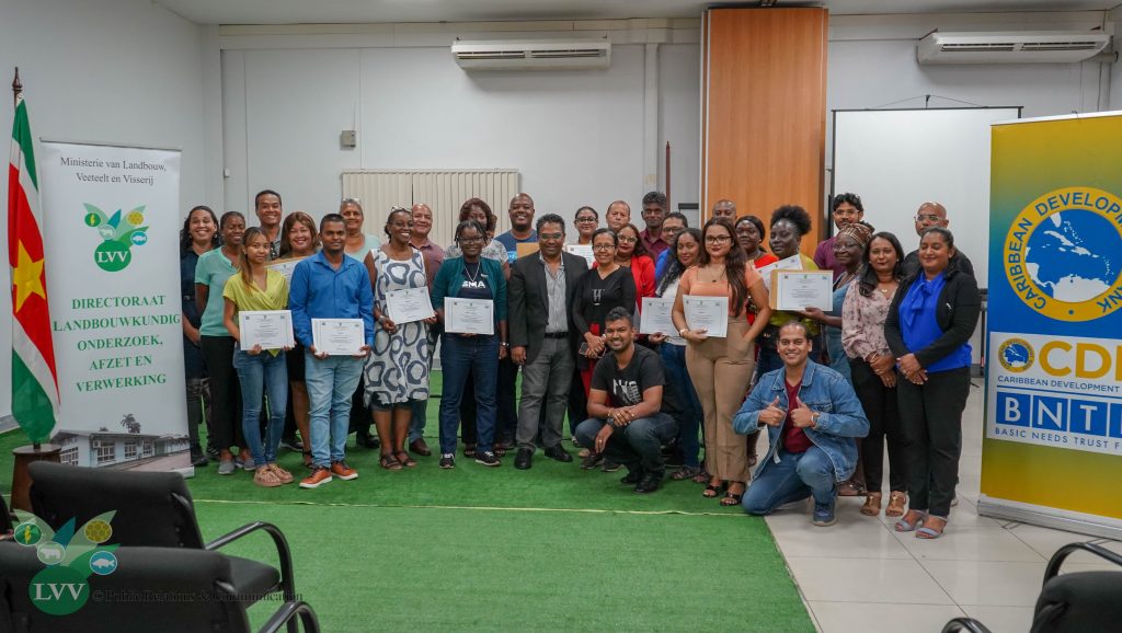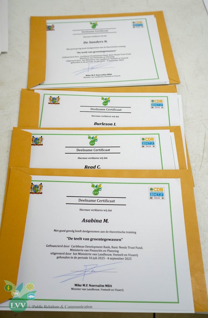 Op het ministerie van Landbouw, Veeteelt en Visserij (LVV) vond op 3 oktober 2025 de certificaatuitreiking plaats aan dertig participanten die succesvol een theoretische agrarische training hebben afgerond. Daarnaast werden ook certificaten uitgereikt aan deelnemers van de training rond Goede Agrarische Praktijken (GAP). De participanten zijn landbouwers afkomstig uit de Saramaccapolder en vertegenwoordigers van Stichting Engedi, een internaat dat via agrarische activiteiten streeft naar meer zelfvoorziening.