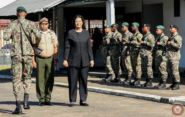 Minister Uraiqit Ramsaran van Defensie heeft afgelopen donderdag tijdens een bijeenkomst in de Memre Buku-kazerne de manschappen van het Nationaal Leger toegesproken in aanwezigheid van president en opperbevelhebber Jennifer Simons, die haar eerste officieel werkbezoek bracht. Volgens de bewindsman zijn de noodkreten van het personeel niet ongehoord gebleven. “Vanaf mijn aantreden op het ministerie van Defensie heb ik aangegeven dat elkeen van u nodig is om de organisatie sterker te maken en dat wij het werk gezamenlijk en stapvoets zullen verzetten. Ik ga u geen gouden bergen beloven, maar wat ik u wel kan aangeven is dat ik mij tot het uiterste zal inzetten, uw noodkreten hoor ik en ik zal meebewegen waar nodig. Maar ook koersvast blijven waar het moet. Zoals u ziet heb ik u gehoord, want we hebben de kwestie van voeding reeds verbeterd we zijn nu ook bezig met de detacheringsposten. Uw noodkreten zijn niet ongehoord gebleven. En zo zullen wij verder de andere zaken aanpakken. Er zijn nog een aantal zaken waar wij de komende tijd aandacht aan zullen geven, maar zoals u weet is de weg van verandering niet altijd even makkelijk”, zei de bewindsman.