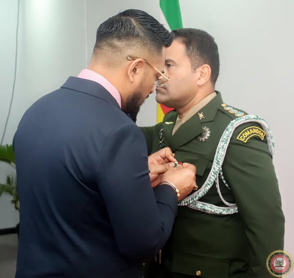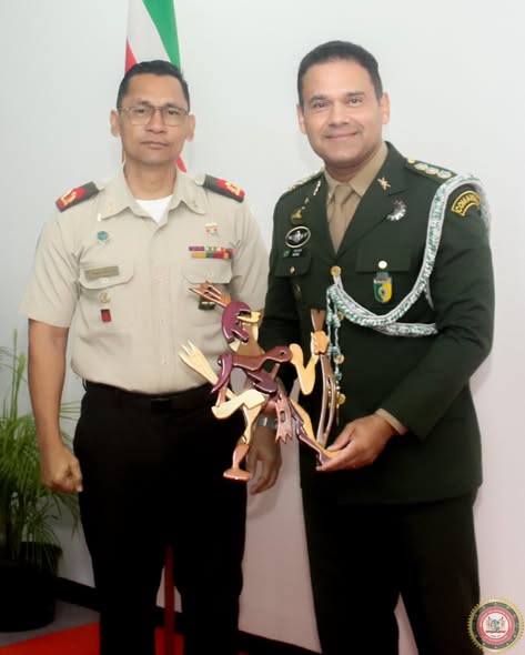 Kolonel Felipe Guimarães Rodrigues, de militaire attache van de Federatieve Republiek Brazilië, is gedecoreerd door minister Uraiqit Ramsaran van Defensie. Hij kreeg de medaille voor speciale verdiensten in de rang van commandeur. Zijn diensttijd in Suriname zit erop. De bewindsman typeerde kolonel Rodrigues als een persoon die door zijn toewijding en oprechtheid bruggen heeft gebouwd en de banden tussen landen heeft versterkt. “Kolonel Felipe, uw diensttijd in Suriname was meer dan een missie. Het was een reis van vriendschap, samenwerking en een reis van onwankelbare inzet aan het versterken van de relatie tussen Suriname en de Federale Republiek Brazilië. U vervulde niet alleen uw plichten, maar u overtrof ze. Door uw leiderschap stonden Suriname en de Federale Republiek Brazilië dichter bij elkaar en werkten ze nauwer samen. U verdiepte de militaire samenwerking met doelgerichtheid en overtuiging”, zei de bewindsman. Hij bedankte de scheidende attache vooral voor het faciliteren van de deelname van Surinaamse militairen aan diverse Braziliaanse militaire opleidingen. Al deze opleidingen hebben in grote mate bijgedragen aan de capaciteitsopbouw van het Nationaal Leger.
