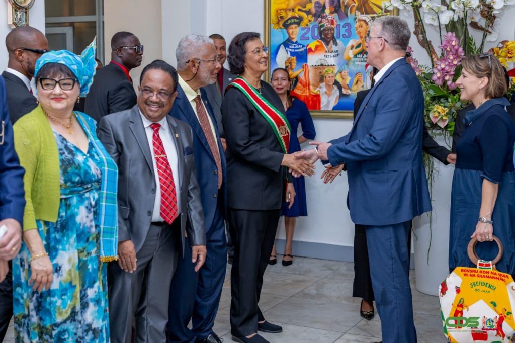 Na de officiële toespraak kregen de buitenlandse gasten en genodigden tijdens de receptie in de ballroom van het paleis de gelegenheid om hun felicitaties over te brengen aan het staatshoofd en haar echtgenoot Glenn Geerling.