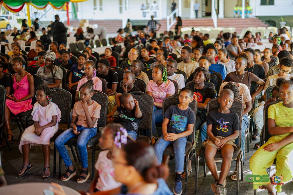 President Simons sprak de jonge gasten persoonlijk toe met een warme groet. “Het is leuk om jullie hier te zien. Ik heb een heleboel van jullie een kleine brasa kunnen geven, maar jullie zijn veel, dus ik kom even iedereen groeten. Ik hoop dat jullie allemaal een heleboel plezier hebben hier vandaag”, zei de president. Ze feliciteerde ook de leerlingen die goede resultaten hebben behaald in het eerste kwartaal en moedigde anderen aan hun best te doen. Haar instructie aan de organisatie was duidelijk: “Laten ze lekker door spelen en lekker eten”.