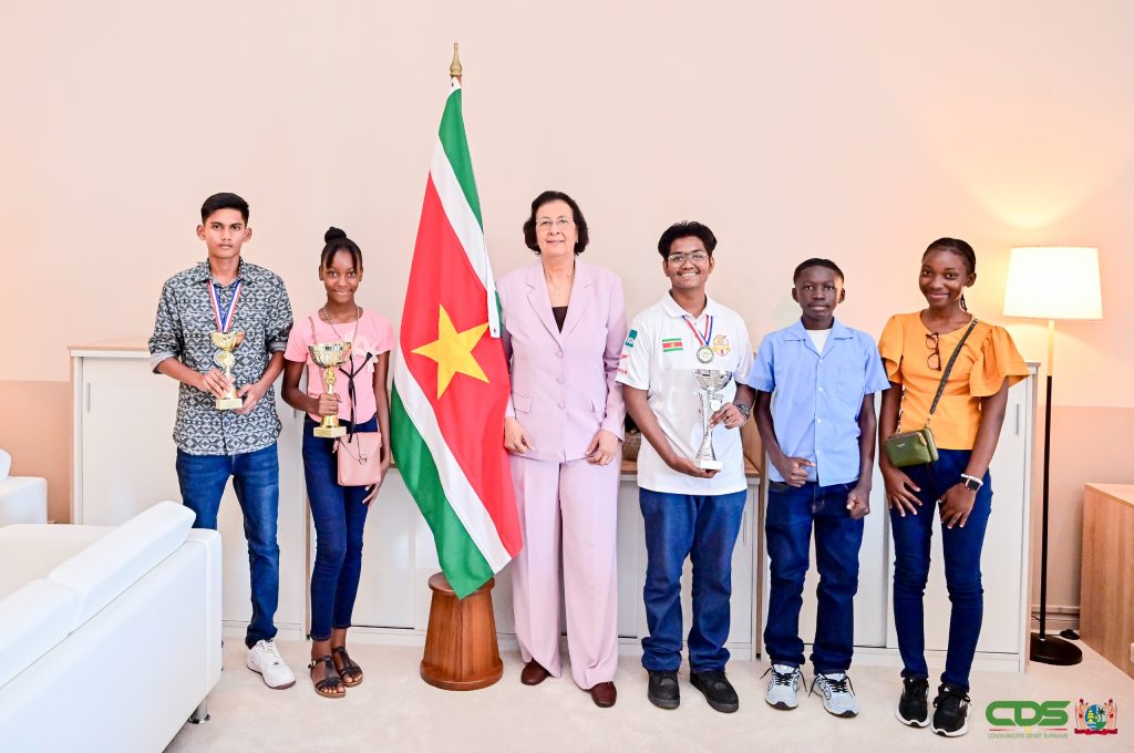 De Surinaamse jeugddammers, die hebben deelgenomen aan het Caribisch Jeugdkampioenschap Dammen 2025 op Curaçao, zijn ontvangen door president Jennifer Simons. De jonge talenten, onder leiding van Internationaal Grootmeester (GMI) Guno Burleson, brachten op het Kabinet van de President een beleefdheidsbezoek aan het staatshoofd. Zij werden geprezen voor hun prestaties en aangemoedigd om zich verder te ontwikkelen.