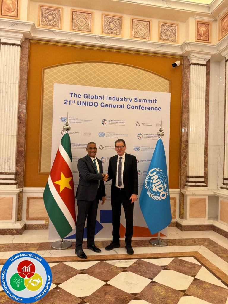 Tijdens de UNIDO General Conference in Riyad, Saudi-Arabië, hebben de regering van de Republiek Suriname en de United Nations Industrial Development Organization (UNIDO) belangrijke stappen gezet om duurzame industriële ontwikkeling en economische transformatie in Suriname te bevorderen. Op 26 november 2025 heeft Suriname officieel een verzoek ingediend voor de ontwikkeling van een Programme for Country Partnership (PCP) voor de periode 2026–2031. Dit werd gevolgd door de ondertekening van een Joint Declaration op 27 november 2025 door UNIDO Directeur-Generaal Gerd Müller en minister Andrew Baasaron van Economische Zaken, Ondernemerschap en Technologische Innovatie (EZOTI).