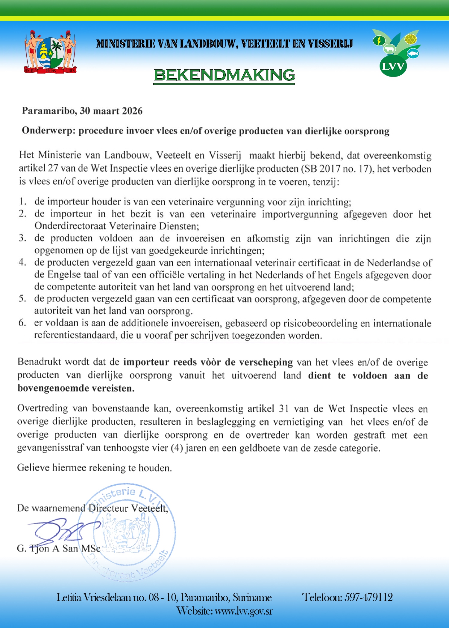 Voor de import van dieren is een veterinaire – importvergunning, afgegeven door het Hoofd van de Veterinaire Inspectie vereist